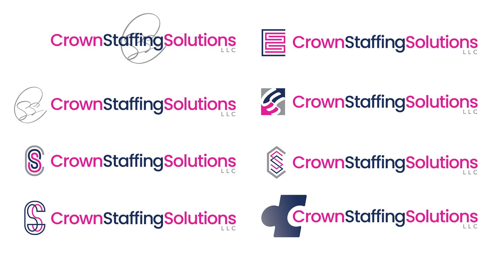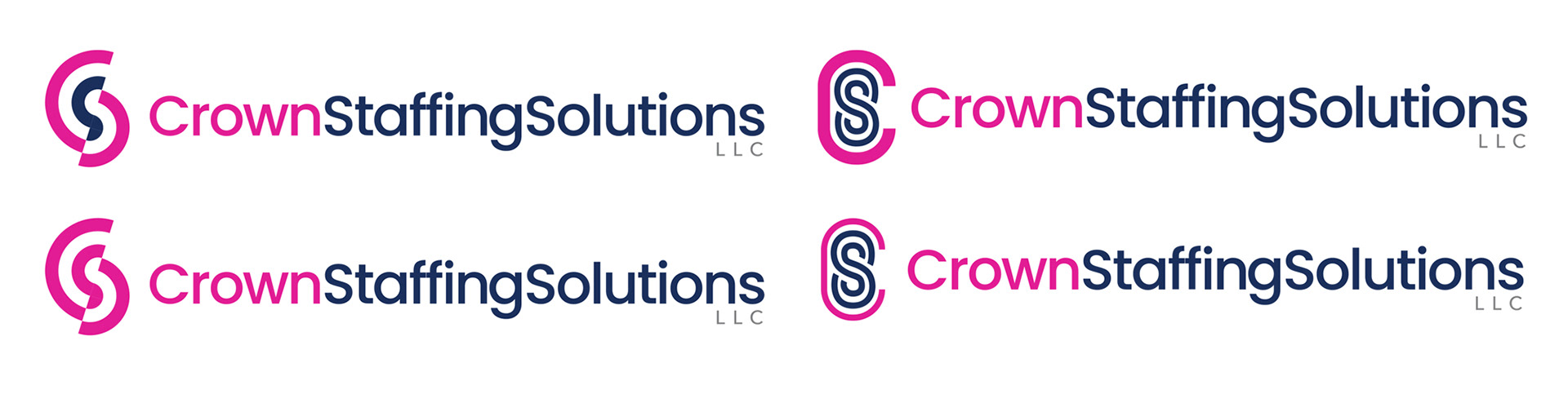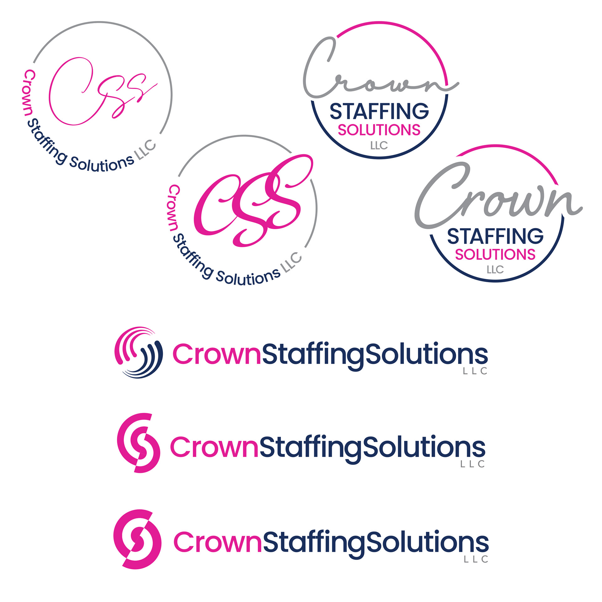 At this point, the name had changed back to 'Crown Staffing Solutions', and they no longer wanted to use the 'SM' initials. Instead, the main brand typeface was locked in, and the goal for this round was to see a range of treatments for the logo icon that incorporated the initials 'CSS'. This group of options went on to the client for review.