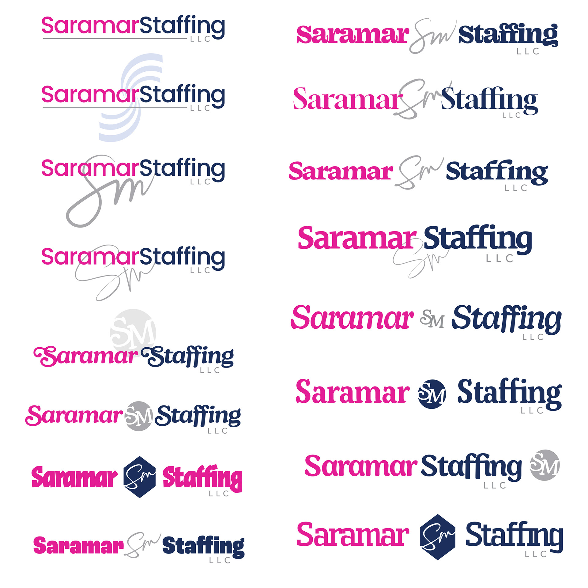 Having used the same logo since their inception in 2016, they decided to update their look once they planned to adopt a new name in 2025, 'Saramar Staffing LLC'. They needed a logo refresh to incorporate the new name, as well as some other additions—incorporating the initials 'SM', as well as using a fuchsia and blue color as their new primary colors instead of the current blue and silver.