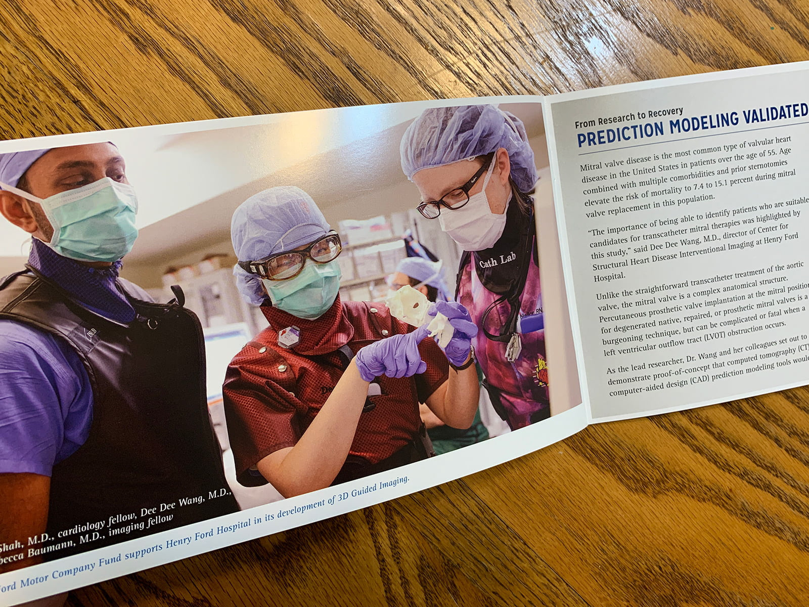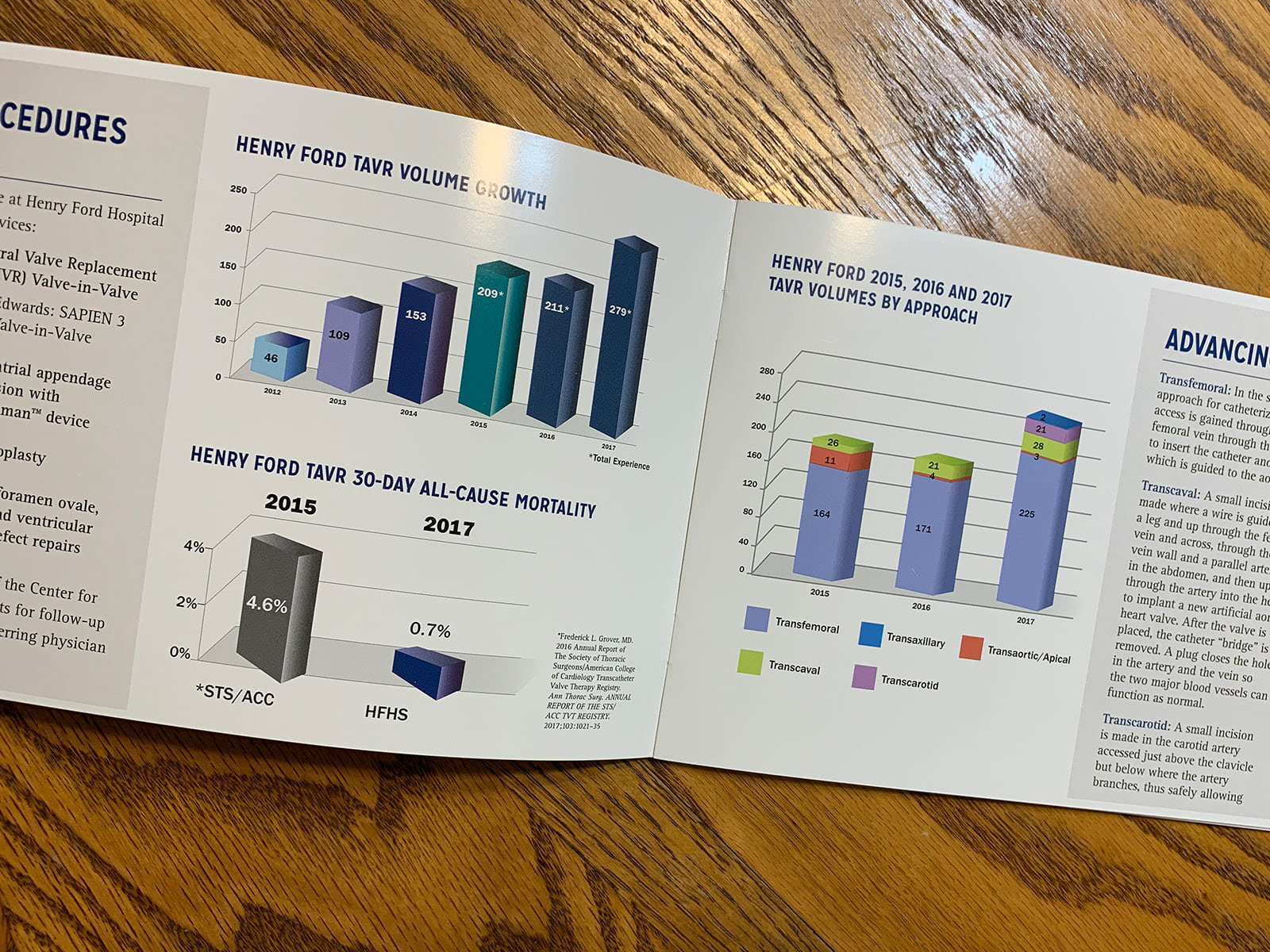 The goal was to lay out the 2017 Outcomes Report for the Center for Structural Heart Disease at Henry Ford Hospital, following their existing format of 6" x 10" saddle-stitched booklet, but incorporating the latest outcomes and data from 2017. The report includes featured transplant stories, as well as shows the results of various heart transplant procedures.