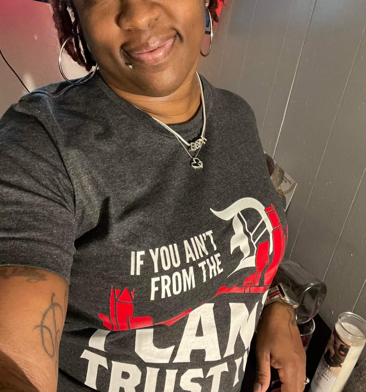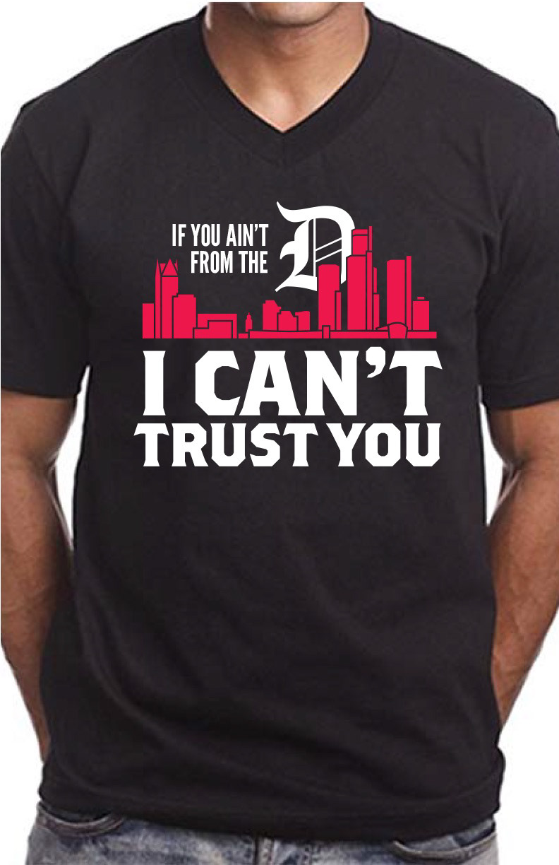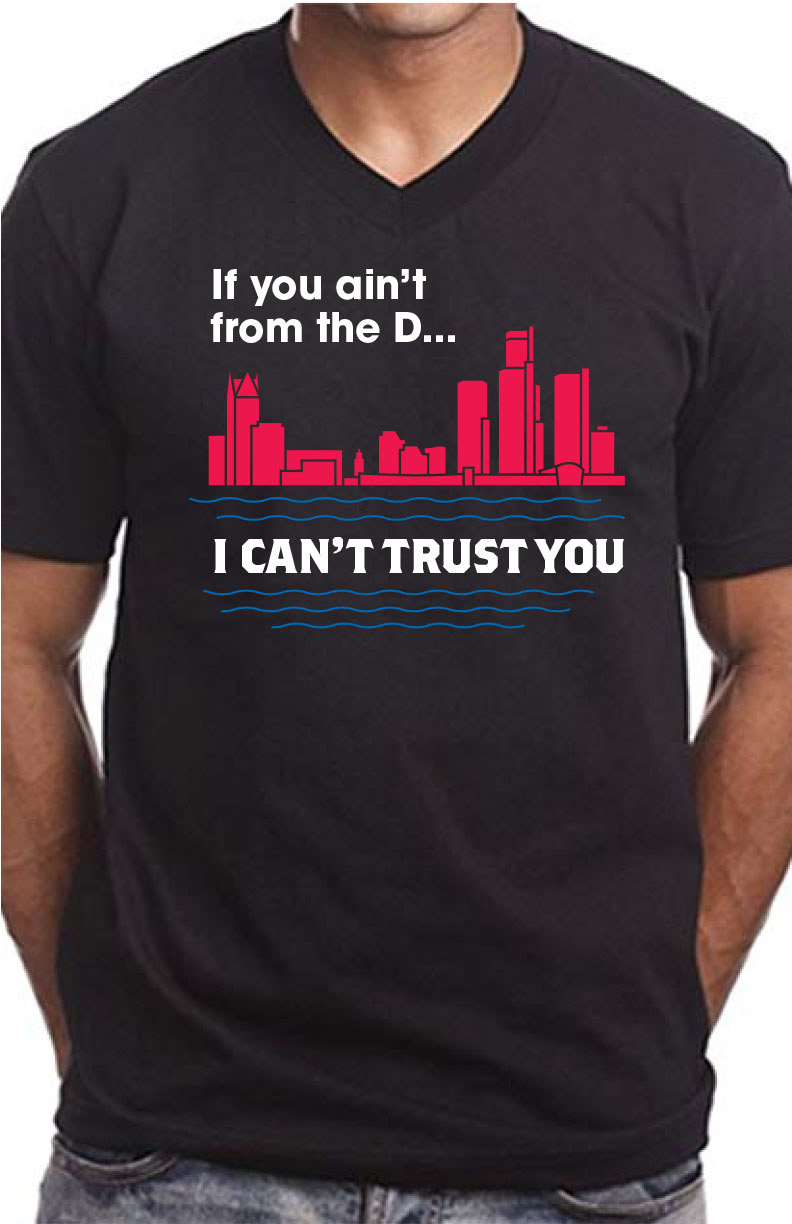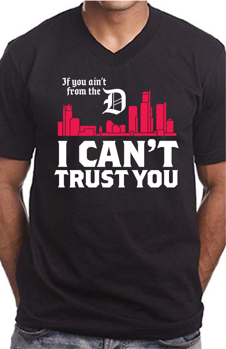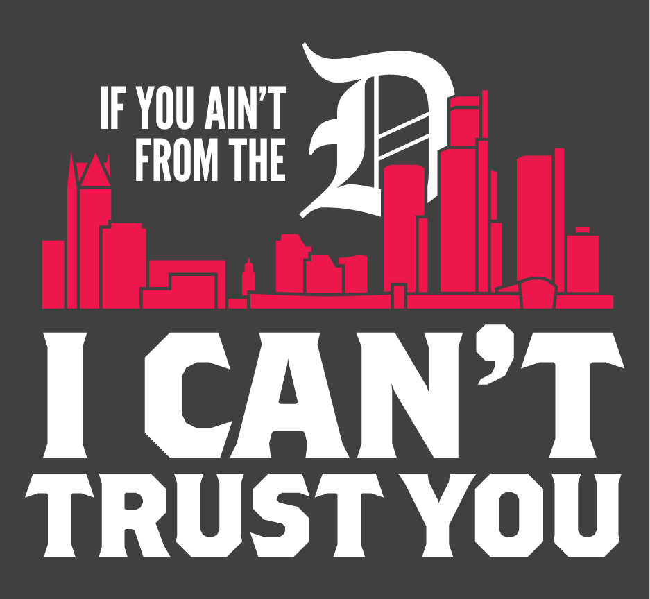 An additional two-color illustration for I Can’t Trust You, incorporating the Detroit Old English 'D' and some iconic buildings from the Detroit riverfront/skyline.