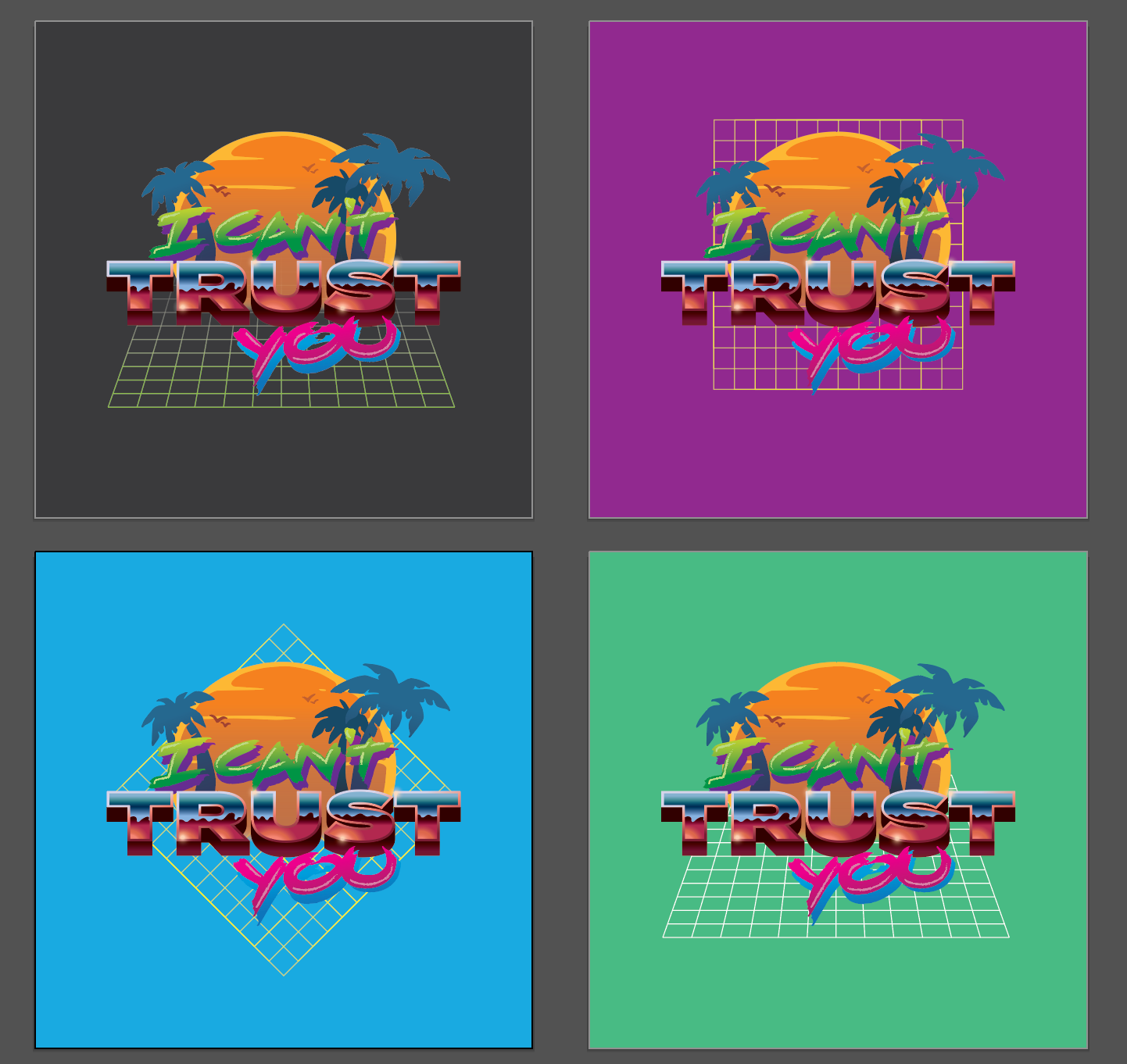 I consulted various animated TV show title sequences from the 1980s for inspiration and went straight to Adobe Illustrator to assemble the essential elements—low setting sun, palm trees, 1980s/90s neon and metallic block lettering, neon horizon grid.